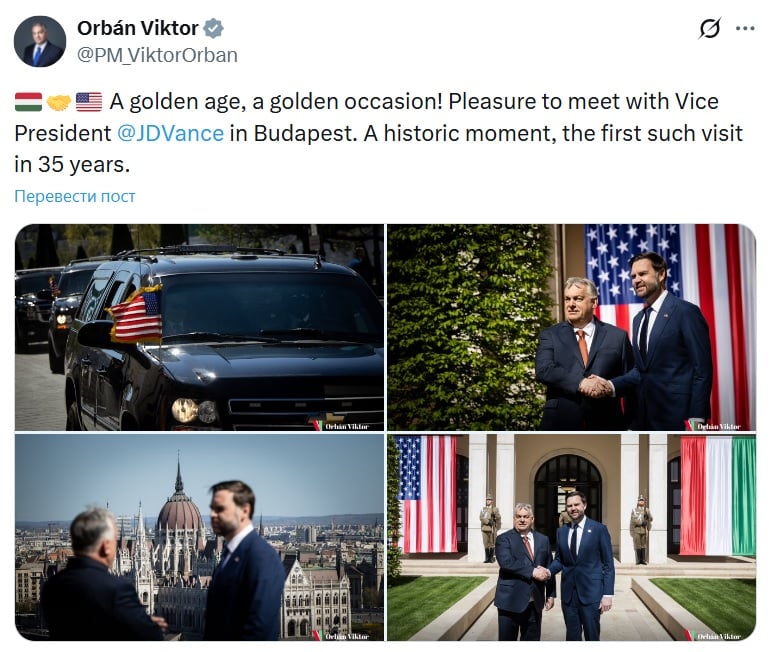 Вице-президент США Джей Ди Вэнс прибыл в Будапешт для участия в мероприятиях вместе с Орбаном. В Reuters отмечают, что визит выглядит как сигнал политической поддержки венгерского премьера перед сложными выборами.