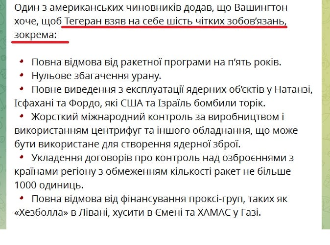 Предполагается, что будущая договоренность должна включать выполнение Ираном следующих требований: восстановление судоходства через Ормузский пролив, ограничения ядерной программы Ирана и решение вопроса с обогащенным ураном, а также долгосрочные обязательства по баллистическим ракетам и поддержке террористических прокси-групп на Ближнем Востоке.