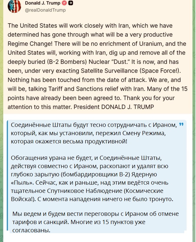 "Соединённые Штаты будут тесно сотрудничать с Ираном, который, как мы установили, пережил Смену Режима, которая окажется весьма продуктивной! Мы ведем и будем вести переговоры с Ираном об отмене тарифов и санкций. Многие из 15 пунктов уже согласованы".