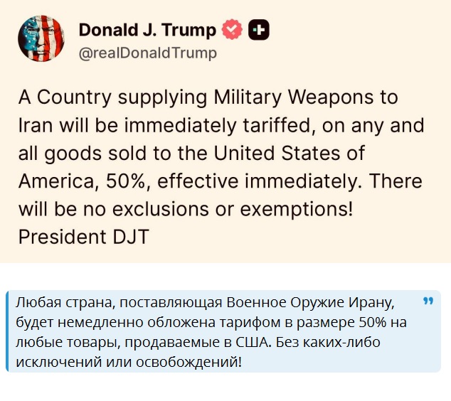 Трамп также пригрозил 50%-ми тарифами любой стране, которая будет поставлять Ирану оружие. Он подчеркнул, что ограничения вступят в силу немедленно и без исключений.