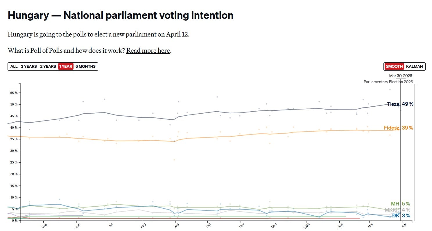 Тем временем статистическая модель POLITICO Poll of Polls, агрегирующая результаты различных социологических опросов, дает следующую картину по предстоящим выборам в Венгрии: партия "Тиса" – 49% голосов, "Фидес" – 39% голосов, "Наша родина" – 5% голосов.