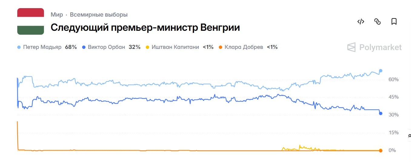 Так, на крупнейшем в мире рынке прогнозов Polymarket, на момент написания новости вероятность того, что следующим премьер-министром Венгрии станет лидер оппозиционной партии "Тиса" Петер Мадьяр, составляет 68%, тогда как до визита Вэнса в Будапешт этот показатель составлял 65%.