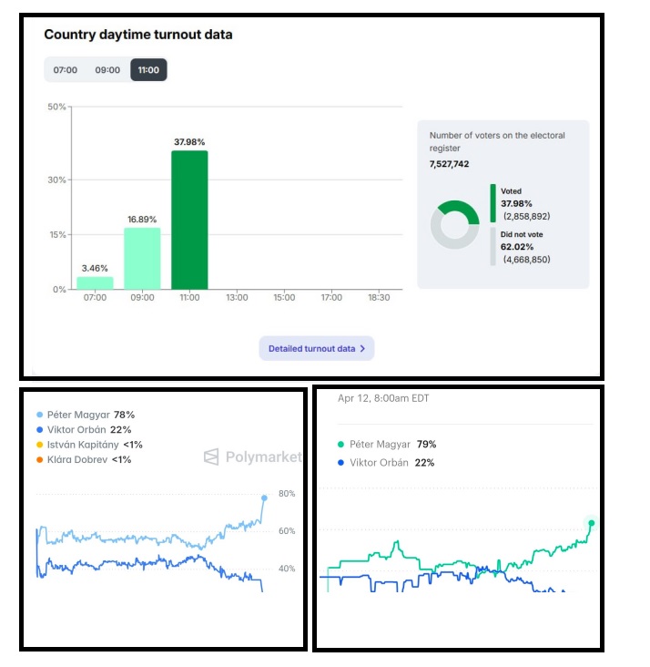 По состоянию на 11 утра проголосовали почти 38% избирателей - значительно больше предыдущего рекорда. Экзит-поллы в Венгрии не проводятся.